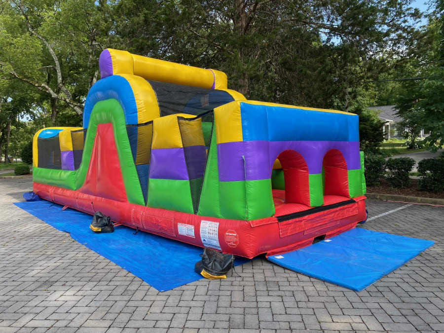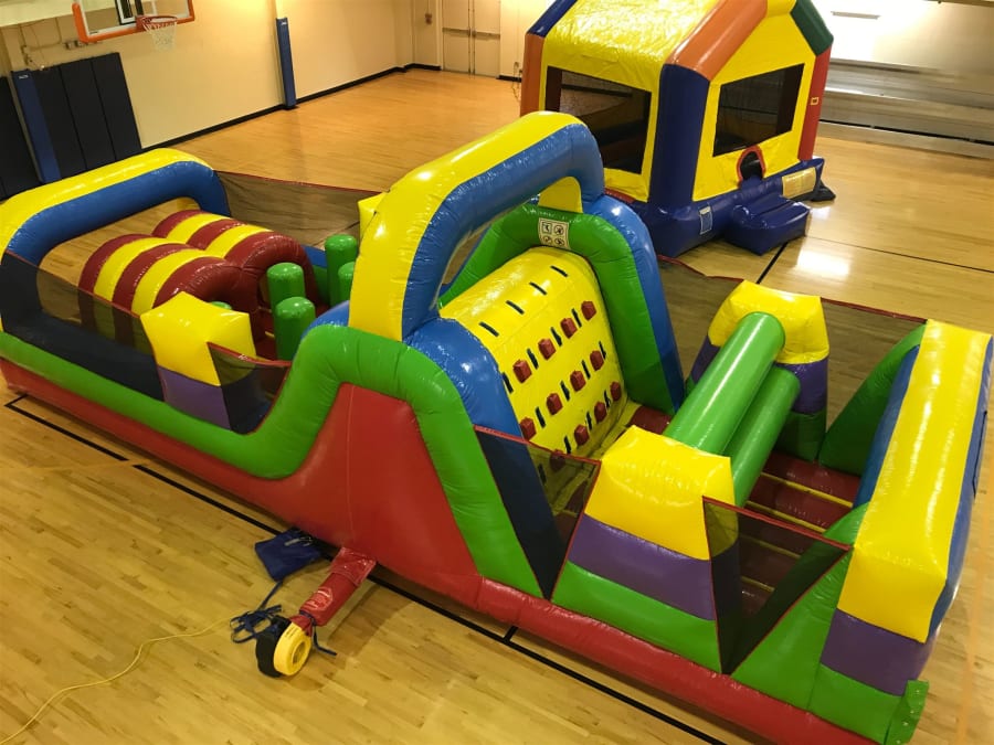 Check out this inflatable obstacle course for your backyard party or event! Race through the obstacles and zip down the slide!