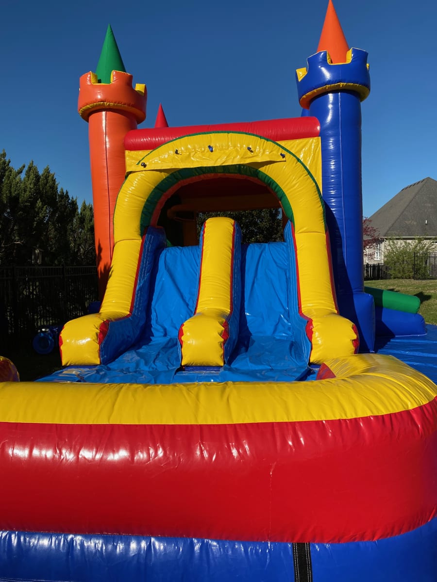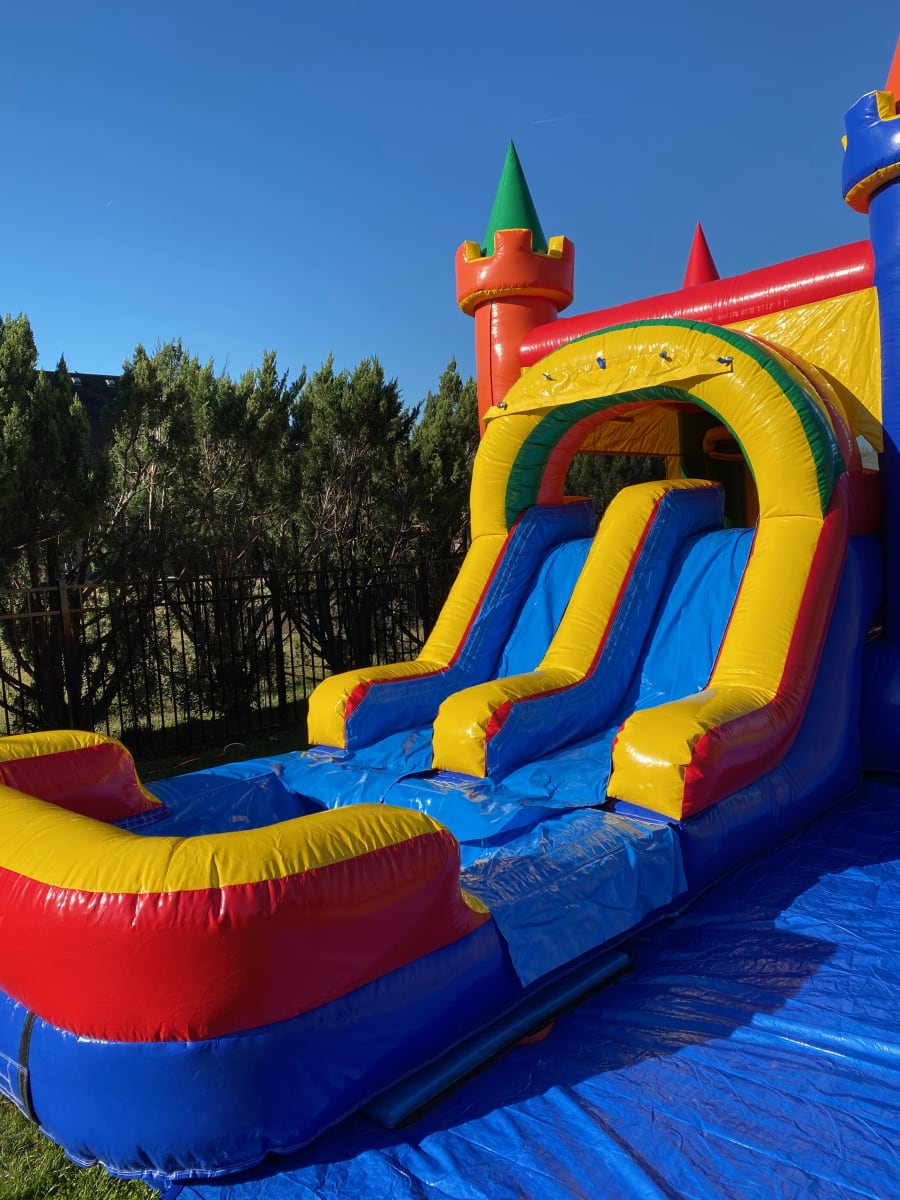 Make your next party a memorable one with our Dual Lane, Castle - Slide Combo! This inflatable water slide and bouncy castle combo is perfect for kids, ages 12 and under. With its dual sliding lanes and large castle bounce house, this versatile inflatable can be used as a dry slide or transformed into a thrilling water slide with a splash pool for those hot summer days.