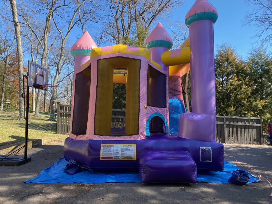 The perfect, pretty bouncy castle for your Princess Party! Bounce, Climb, Slide, and a Basketball Hoop inside this Bouncy Castle. This color scheme goes perfectly with Disney Princess parties, Minnie Mouse parties, Frozen theme parties, and more!