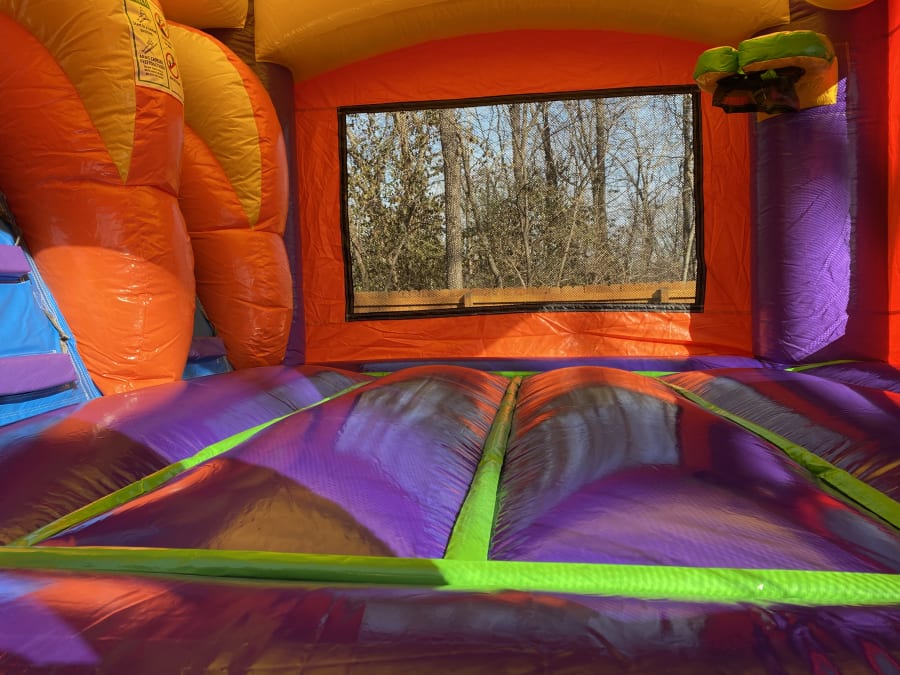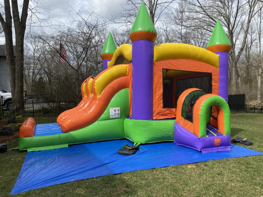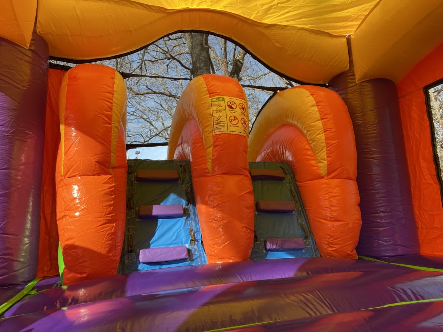 Kids love this colorful bouncy castle! Plenty of room to bounce around and a double-lane slide!