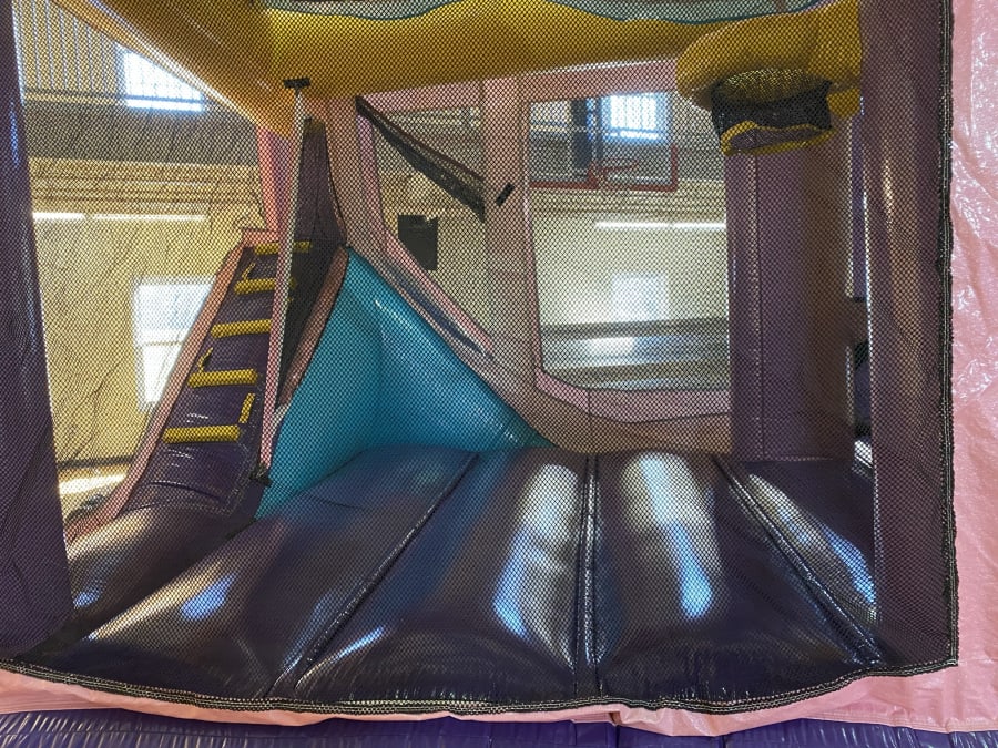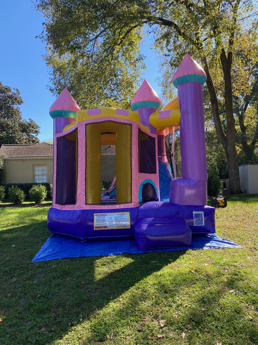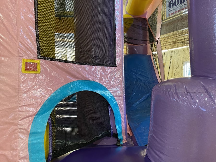 The perfect, pretty bouncy castle for your Princess Party! Bounce, Climb, Slide, and a Basketball Hoop inside this Bouncy Castle. This color scheme goes perfectly with Disney Princess parties, Minnie Mouse parties, Frozen theme parties, and more!