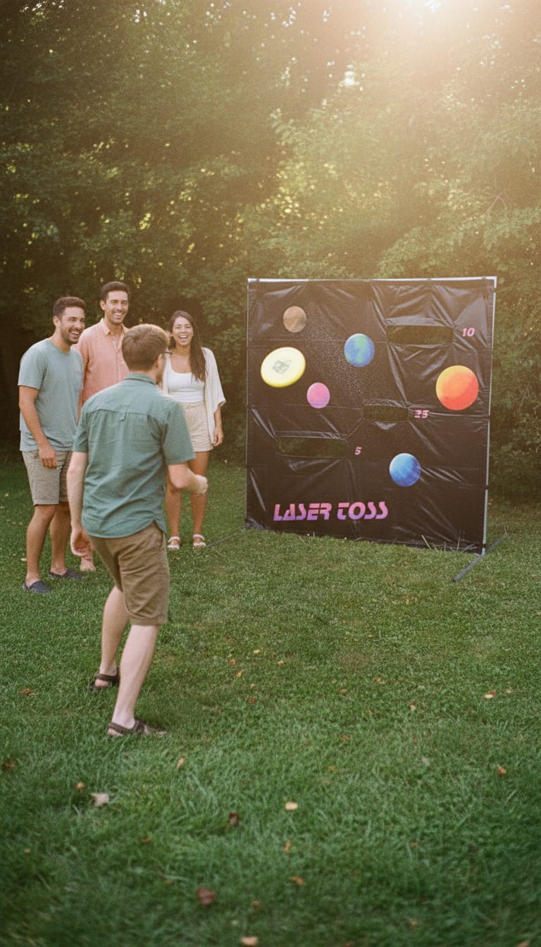 Looking to add some excitement to your community event or backyard party? 🎉 Look no further than Laser Toss! This engaging game will keep your guests entertained for hours as they compete to throw frisbees into targets with different point values. 🎯 Perfect for birthday parties or any outdoor gathering, Laser Toss is a hit with all ages!
