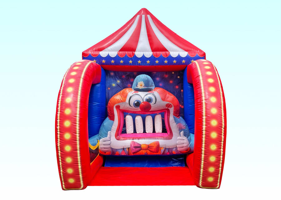 Meet the Clown Tooth Knockout! This colorful, eye-catching inflatable draws guests in for a fun challenge. Players toss bean bags to knock out all four clown teeth. Can you clear them all in a single turn?