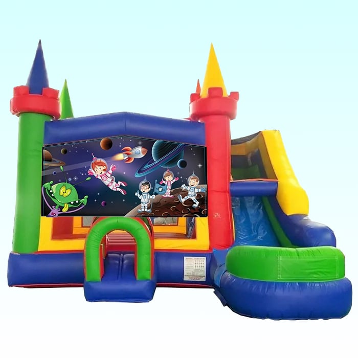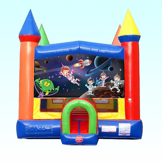Add this Space Explorer Theme to our Castle Bounce House for $209 or upgrade to the Castle with Slide (water or dry) for $299.