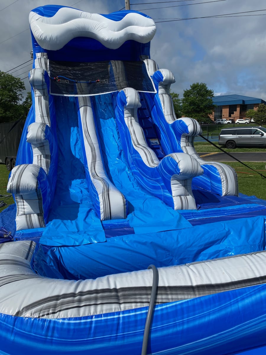 Double Lanes and Double the Fun! This water slide is 17 feet tall with 2 sliding lanes into a big splash pool!