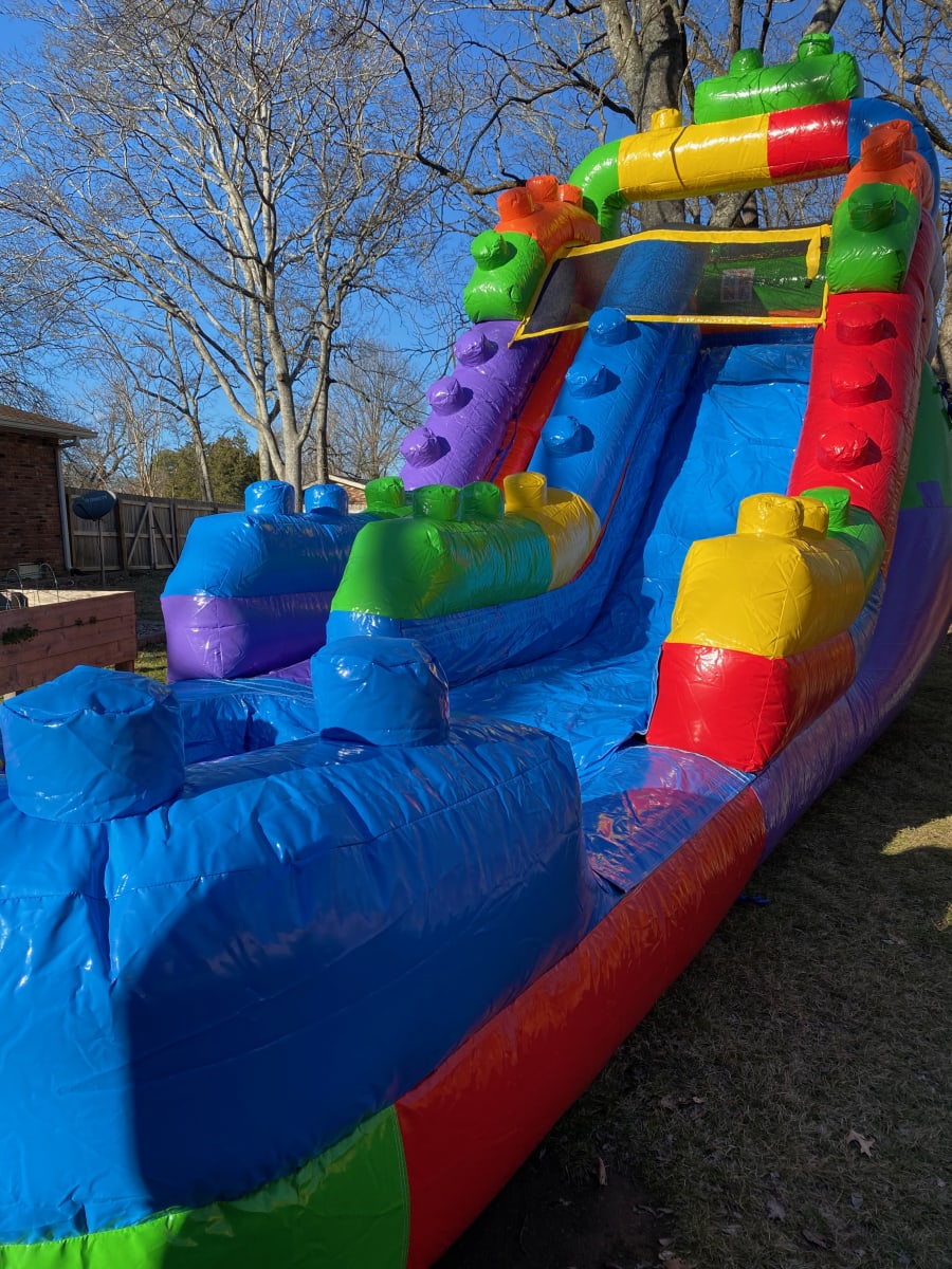 This lego-themed slide stands an impressive 16 feet tall, guaranteeing hours of endless fun for the kids! We recommend ages 4 - 12 for this slide. The weight limit is around 150 lbs per rider. 50 feet of water hose is included. Please have additional hoses available, if needed.